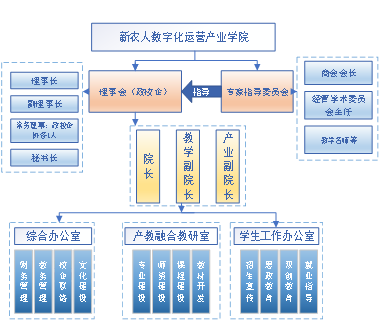 新农人数字化运营产业学院强化高校、合作企业、地方政府、行业协会的多元主体协同作用,“政”、“校”、“企”、“协”多维联动,现代产业学院成立理事会,实行理事会领导下的院长负责制。理事会由7名理事组成,其中yl6809永利集团3人,好品文化发展有限公司3人,政府1人。产业学院院长兼任本着合作共赢的原则,积极推进现代产业学院的建设与改革。如图1所示。