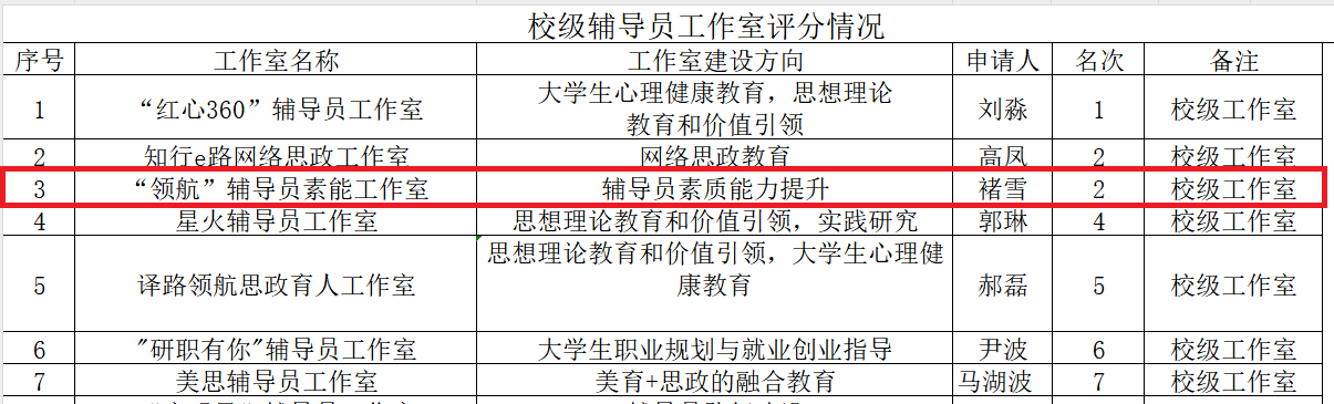 “领航”辅导员素能工作室的成功立项,是学校对我院辅导员队伍建设工作的充分肯定,也是我院思政育人工作迈向专业化、品牌化的重要机遇。未来,工作室将以此为契机,聚焦辅导员专业成长核心需求,搭建集交流学习、研究培训、实践创新于一体的优质平台,持续提升辅导员的职业素养与业务能力,为学院思政工作高质量发展注入强劲动能,切实助力学生全面成长成才!