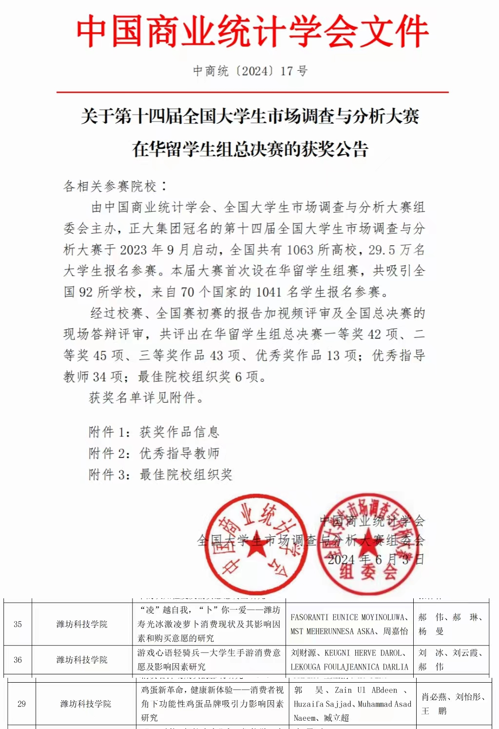 全国大学生市场调查与分析大赛是由中国商业统计学会主办,属于教育部竞赛排行榜A类赛事,今年首次在全国设立在华留学生组的比赛。该项大赛2023年9月份启动,共吸引全国92所高校,来自70多个国家的1041名学生报名参赛。我院获奖团队通过对各自的项目展开全面且深入的调查,并运用自身专业知识进行精确的数据收集和深入地分析,建立科学合理的分析模型,为各自领域的发展提供了有力的数据支持和策略建议。