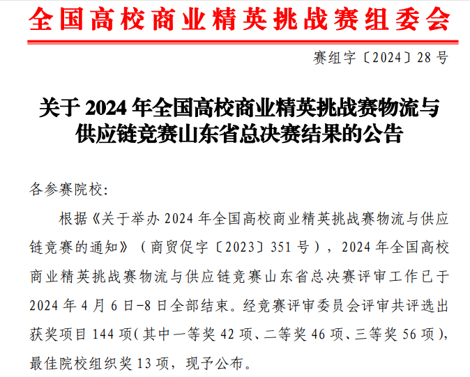 2024年4月11日,全国高校商业精英挑战赛物流与供应链竞赛山东省总决赛成绩揭晓,我校yl6809永利官网集团首次参加此项大赛,派出2支队伍参加比赛,2023级市场营销专业学生崔心悦、王玉娟、崔鑫团队与2023级国际商务专业学生徐晓丽、梁晓君、李玉团队,均获得本科组一等奖的好成绩。