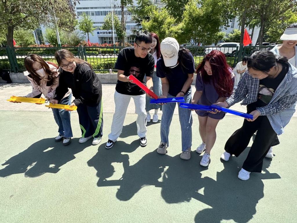 N人N足小游戏采取组队作战的方式,每队人数2-10人不等,相邻的脚绑在一起,比赛开始,向终点跑去或走去,耗时最短的队伍获胜。该活动能极大程度考验同学们的反应能力,提高了同学们的合作能力。