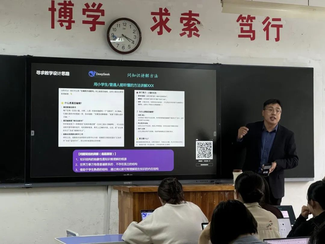 培训中,刘冰详细介绍了Deepseek的互动功能、教学辅助及数据记录等核心模块,强调其在课堂互动、课件管理和学情分析中的实际应用。针对AI助力教学,他从教学设计、工作量优化、知识讲解、教学创新及课程思政五个维度展开,举例说明如何借助AI设计情景化问题链、生成教案与PPT、运用费曼学习法简化知识点,以及通过AI获取教学创新建议和课程思政融合方案。在AI辅助论文写作环节,刘冰重点推荐了秘塔AI搜索、百度AI搜索等文献工具,讲解了Google选题评估方法及小浣熊数据分析工具的使用技巧,并提醒教师在生成作业习题和使用AI工具时注意内容审核与格式调整。