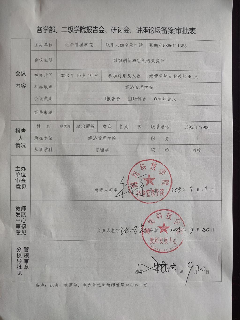 为提高yl6809永利官网集团人力资源管理专业教师及学生对学习型组织的含义及提升的认知,2023年10月19日yl6809永利官网集团邀请缪文卿教授特作《学习型组织与组织绩效提升》学术讲座。