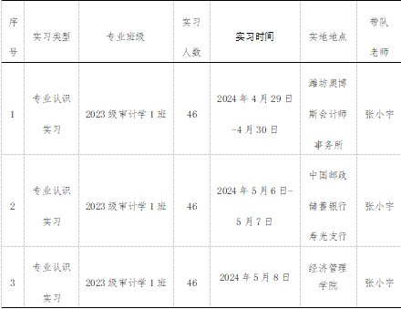 2023级审计学1班专业认识实习时间为2024年4月29日—4月30日、5月6日—5月8日,实习地点:潍坊奥博斯会计师事务所、中国邮政储蓄银行寿光支行。